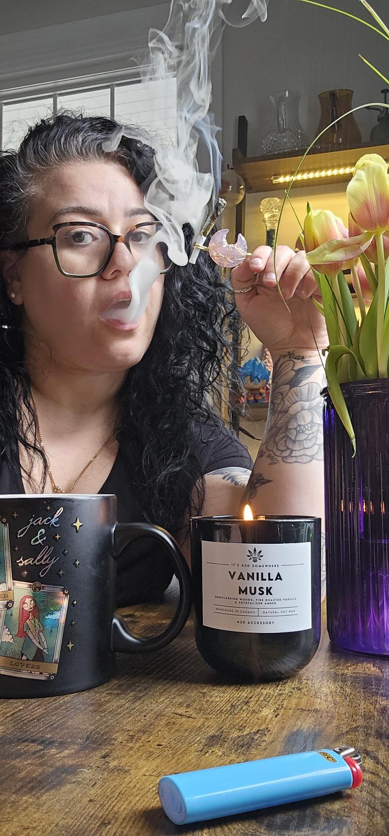 when getting high and doing DIY projects in my house became the spark for something much bigger. I wanted to create a space where I could proudly display my beautiful bongs and flower, so I designed my very own "Coffee and Cannabis" bar. It became my safe place, and in that freedom, I found my purpose within the cannabis community. I was determined to embrace my love for cannabis, break free from the stigma surrounding it, and create something that reflected my passion.